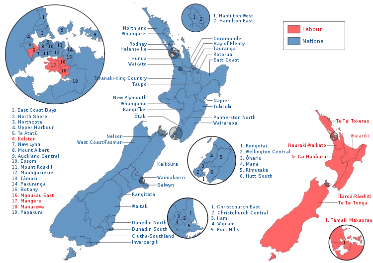 ![]() Map of the general election. Electorate results are shown on the left, Maori electorate results in the centre, and the additional members on the right. | ||||||||||||||||||||||||||||||||||||||||||||||||||||||||||||||||||||||||||||||||||||||||||||||||||||||||||||||||||||||||||||||||||