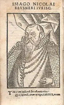 Nicolaus Reusner (also von Reusner, Reusnerus; 1545–1602) was a German jurist and publisher. He was born into a family of wealthy German landowners in Löwenberg, Silesia, who had recently moved there from Transylvania. Several members of his family became famous in the fields of law and medicine in the 16th century, including his brothers Bartholomäus von Reusner (1532–1572, medicine), Elias Reusner (1555–1612, history and medicine) and Jeremias von Reusner (law). Reusner studied in Wittenberg and Leipzig, under Modestinus Pistoris, and Leonhard Badehorn. In Leipzig, imperial personal physician Georg Wirth (1524–1613) persuaded him to abandon medicine and study law.