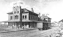 In 1853, the station consisted of several buildings that were surrounded by tracks. The access to the station ran over the tracks and was blocked by a barrier; next to it there was a crossing keeper's house. Passengers were able to drive from the station to their destination by carriage.