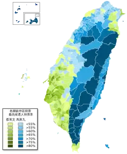The data of historical elections show a divide between urban versus rural voters, and northern versus southern Taiwanese.[17][18] For instance, voters from municipalities in northern Taiwan were more inclined to support same-sex marriage legalization. Among the top ten cities in favor of same-sex marriage were the far northern cities of Taipei, New Taipei, Hsinchu, and Keelung.[18]