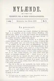 Nylænde (Norwegian: New Frontiers) was a Norwegian political and cultural magazine that focused on women's rights. It was regarded as one of the most influential political magazines in Norway in its time and played an important role in the early Norwegian women's rights movement, and the struggle for women's suffrage.[1] It was succeeded by the journal Kvinnesaksnytt in 1950.