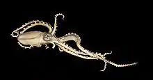Female tuberculate pelagic octopuses are known to have a high fecundity, producing nearly 100,000 eggs. One female specimen caught in May 2003 had a record-breaking 1 million eggs, the most of any Octopoda.[5] Egg size is typically very small, measuring 1.75 mm long and 1.00 mm wide.[4] This has been seen as a trend in other pelagic octopus species. Tuberculate pelagic octopuses is said to be viviparous, meaning their offspring develop with in the body of the parent.[4] However, several different authors dispute exactly how and where this development occurs. The general consensus is the eggs develop in expanded oviducts.[4] Fertilization occurs when the hectocotylus is deposited from the male in the female's mantle cavity.[4]
