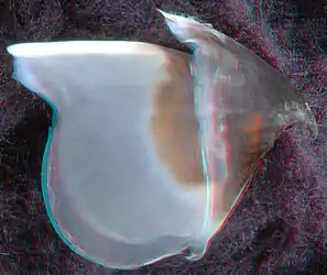 Ocythoe are one of the few cephalopods to have a swimbladder.[3] In captivity, two specimens were observed controlling their buoyancy and shooting water "forwards, upwards, sideways, and backwards" from the upper channel of the mantle cavity. Ocythoe achieves this by altering the dorso-lateral corners of the mantle opening.[3] The entire swimbladder structure rests on the "visceral mass" and connects to the mantle cavity. It is also innervated and vascular.[3] Juvenile and adult swimbladders exhibit key differences. Juveniles tend to have thicker and "gelatinous" walls with more spherical cells.[3] Adults on the other hand have a less gelatinous appearance and a constitutively open lumen.[3] Dwarf males do not possess swimbladders.[3] Ocythoe is the only cephalopod to possess a proper gas bladder, based on specimens kept in captivity, although the origins of the gas is still an area of research.[3]