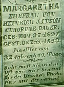 The first burials were made in January 1843, when a child Joseph Menke and an adult John Herman Dornkamp were laid to rest. Each of the German RC churches had a section in the old cemetery and many of the older monument's inscriptions contain only German.