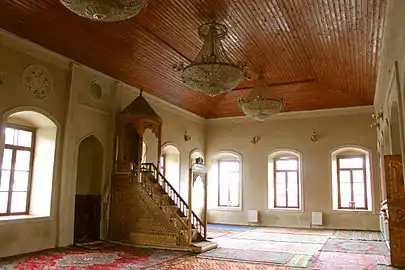 There is an open balcony in the front of the mosque's entrance door. The worshipers perform the ablution in the pool located in the courtyard of the mosque, and then go to the spacious and bright hall to pray.[4] The main prayer hall has 14 windows. In the front of the main prayer hall is an even larger prayer room, with a total area of 80 m2, 45 of which are given to women, and the rest is used as a corridor.
