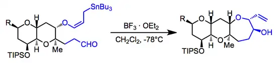 Repeated use of the allylic stannane addition in an intramolecular sense was used in the synthesis of hemibrevetoxin B (one example is shown below). The pseudoequatorial positions of both "appendages" in the starting material lead to the observed stereoisomer.[17]