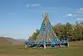 Ovoo, oboo, or obo (Mongolian: овоо, pronunciation , Buryat: обоо, Khakas: обаа, Traditional Mongol: ᠣᠪᠤᠭ᠎ᠠ,[1] "heap";[2] Chinese: 敖包 áobāo, lit. "magnificent bundle [i.e. shrine]") are cairns used as border markers or shrines in Mongolian folk religious practice and in the religion of other Mongolic peoples. While some ovoos simply consist of a mound of stones, most have branches and khadag stuck into them. In the absence of stones, ovoos can be made entirely of branches,[2] or even soil or sand.[3]
