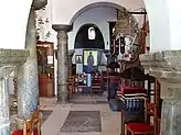 The iconostasis, which separates the eastern end of the main hall of the church from the chancel (called the "bema" in Orthodox tradition), is notable for its brilliantly multicoloured effect.[2] It has the usual five-part structure. The lower part consists of the original furnishings from the construction of the church around 1100. The upper part consists of an engraved wooden post-Byzantine architrave, a frieze with fourteen icons and a carved top.[3] The variety of ornaments is considered unique in the Middle Byzantine Era, with links to the 6th century[2] and to churches in Constantinople, Venice and Ravenna.[4]