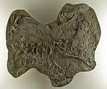Fossils of Panphagia were found in late 2006 by the Argentinean paleontologist Ricardo N. Martínez in rocks of the Ischigualasto Formation of Valle Pintado, Ischigualasto Provincial Park, San Juan Province, Argentina. The bones were found at approximately the same level as a 231.4 million year old ash layer, indicating it lived during the early Carnian of the Late Triassic.[1] Panphagia is currently known from holotype PVSJ 874, the disarticulated remains of one partially grown individual of about 1.30 metres (4.3 ft) long. Portions of the skull, vertebrae, pectoral girdle, pelvic girdle, and hindlimb bones have been recovered. The russet-colored fossils were embedded in a greenish sandstone matrix and took several years to prepare and describe.[2]