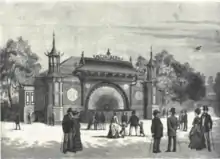 When the Tivoli Gardens first opened in 1874, a small theatre was already found at the site of the current building just inside the main entrance. It was made out of timber and painted canvas and after a series of rebuilding and major repairs, it was finally decided to replace it with a more up-to-date building in 1873. The architect Vilhelm Dahlerup, at that time working on the design of the Royal Danish Theatre was commissioned to make a proposal and the year after in 1874, the same year as the Royal Theatre, the present Peacock Theatre in Chinese style was inaugurated. Dahlerup had never been to China but he sought inspiration from pictures of buildings, borrowed from an engineer who had been stationed in the Far East.[1] The technical side of the project was constructed by the theatre's director and Pierrot Niels Hendrik Volkersen and timber and assistance with the cordage was obtained from the Holmen Naval Base.[1]