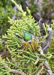 | Paracotalpa puncticollis, adult, feeding on juniper leaves. | |