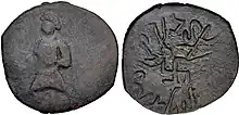 Coinage was issued in five denominations: didrachms, drachms, hemidrachms, quarter drachms, and obols; all rulers did not issue every denomination. The first six rulers minted stable denominations in silver that were devalued and then replaced by billon than copper.[8] Tandon notes multiple similarities with Indo-Parthian coinage, especially in the metrological standards and shape, and the coinage of the Western Satraps, especially in materials.[9][lower-alpha 2]