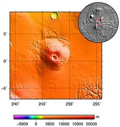 Pavonis Mons /pəˈvoʊnɪs ˈmɒnz/[2] (Latin for "peacock mountain") is a large shield volcano located in the Tharsis region of the planet Mars. It is the middle member of a chain of three volcanic mountains (collectively known as the Tharsis Montes) that straddle the Martian equator between longitudes 235°E and 259°E. The volcano was discovered by the Mariner 9 spacecraft in 1971, and was originally called Middle Spot.[3] Its name formally became Pavonis Mons in 1973.[4] The equatorial location of its peak and its height make it the ideal terminus for a space elevator,[5][6] and it has often been proposed as a space elevator location, especially in science fiction. It is also an ideal location for a Sky Ramp.