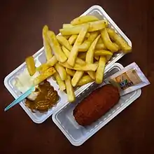 The Netherlands adopted peanut sauce as a common side dish through its former colonization of South East Asia. Besides being used in certain traditional Indonesian and Dutch-Indonesian dishes, it has found its way into a purely Dutch context when it is eaten during, for instance, a (non-Asian style) barbecue or with French fries. A popular combination at Dutch fast food outlets is French fries with mayonnaise and peanut sauce (often with raw chopped onions and with ketchup or Dutch currysauce), called a Patatje Oorlog (lit. "Fries War").[7] Peanut sauce is also eaten with baguette, bread, cucumber or potatoes. It is also used as an ingredient in the deep-fried snack food called Satékroket, a croquette made with a flour-thickened ragout based on Indonesian satay.