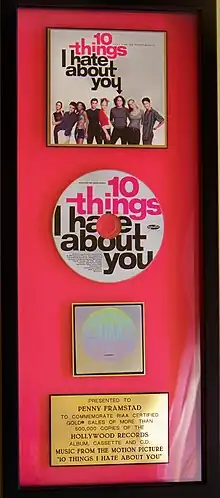 She co-wrote, Even Angels Fall, (Kim Bullard, Tom Whitlock, Jessica Riddle) recorded by Jessica Riddle on Hollywood Records appeared in the film, 10 Things I Hate About You, and on the soundtrack, earning her a gold record for album sales of over 500,000 copies. Even Angels Fall, reached #27 on Billboard Adult Pop Songs airplay chart and remained on the chart for 12 weeks.[8][9]"Fly Away" recorded as a duet by Sara Wasserman and Aaron Neville (written by Penny Framstad and Sara Wasserman) was released in June, 2009 on "That Other Label".[10]