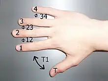 For convenience, pen spinners have adopted a common numbering to represent the fingers and the spaces between them, called finger slots. The fingers are numbered sequentially from "1" for the index finger, to "4" for the little finger, and the letter "T" is used for the thumb. Finger slots are represented by placing any two or more of these together. For example, the space between the index and middle fingers is called "12". A pen held between the thumb and ring finger is in slot "T3". Symbols and slots can be expanded to include other parts of the hand, body, and surrounding atmosphere. The webbing at the base of the thumb and index finger is called "TF", for thumb flap, and the palm is usually notated as "P". The "*" symbol is sometimes used to refer to the absence of a second body part or object holding the pen (e.g., a pen resting on the surface of the palm is in slot P*, or, more literally, PAir). Other slot systems have been invented in order to describe complicated positions, but these are usually only used when necessary to avoid ambiguity.