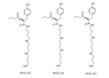 PhTX-433 was structurally elucidated and synthesized in 1988 by Eldefrawi and colleagues. For the isolation and structural identification of PhTX-433 female wasp venom glands were fractionated using reverse-phase HPLC and fractions were tested for pharmacological activity. The most pharmacologically active sample was re-fractioned using the same method. UV spectrum and H1NMR analysis revealed that the structure consisted of a butyrl/tyrosil/polyamine sequence. Three isomers, PhTX-433, PhTX-343, and PhTX-334 (see image at upper right of this section), were determined to be possible candidate structures and all three were synthesized. PhTX-433 was found to be identical to the natural product isolated from the fractionalization in terms of H1NMR, mass spectrometry, HPLC, and biological activity. PhTX-433 was therefore designated as the structure of the most biologically active naturally occurring philanthotoxin.[15] Because PhTX-433 lacks strong receptor subtype selectivity, a variety of analogs have been synthesized as candidates for potential pharmacological exploitation.[10] Philanthotoxins have four distinct regions that can be modified (see image at lower right of this section); the number of nitrogens in the polyamine chain is the most common distinction between synthetic analogs.[10] The most commonly synthesized and studied analogue is PhTX-343, which has similar properties to PhTX-433.[10] Notably, philanthoxin and its synthetic analogues are smaller than similar polyamine toxins form orb-web spider venoms and argiotoxins, and are easier to synthesize.[15]
