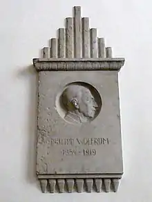 Born in Schwarzenbach am Wald, Philipp Wolfrum was the son of Johann Heinrich Wolfrum, a teacher and church musician (Kantor). He first also worked as a teacher. On a scholarship, he studied from 1876 at the Königliche Musikschule in München organ and composition with Joseph Rheinberger, piano with Karl Bärmann, and choral singing and conducting with Franz Wüllner. From 1878 he was conductor, soloist and composer in Bamberg. In 1884 he was appointed an assistant teacher for music at the theology seminary of Heidelberg University. There, he installed formal education in church music, and initiated public musical events in the town. In 1885 he founded the choirs Akademischer Gesangverein and Bach-Verein (now: Bachchor Heidelberg). In 1888 he was appointed Außerordentlicher Professor. In 1890 he published Die Entstehung und erste Entwicklung des deutschen evangelischen Kirchenliedes in musikalischer Beziehung (The origins and initial development of the German Protestant hymn). In 1894 he was awarded the title of Universitätsmusikdirektor, and in 1907 became Generalmusikdirektor.[1]