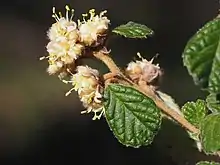 Pomaderris prunifolia, commonly known as plum leaf pomaderris,[2] is a plant in the family Rhamnaceae. It has slightly toothed, wrinkled green leaves, stems with rusty coloured star-shaped hairs and yellow flowers.