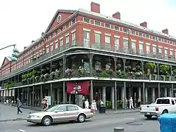 Baroness Pontalba, an accomplished businesswoman, invested in real estate, purchasing the land on the upriver and downriver sides of the Place d'Armes. She constructed two Parisian-style row house buildings between 1849–1851, at a cost of over $300,000. The buildings include the first recorded instance in the city of the use of cast iron 'galleries', which set a fashion that soon became the most prominent feature of the city's residential architecture.[3] The cast-iron panels in the first floor balustrade feature her initials, 'AP', intertwined in the design.