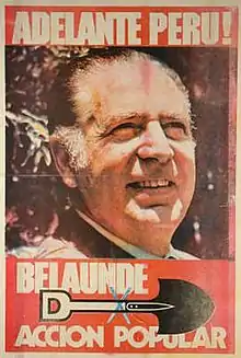 Although Belaúnde's message was not all that different from APRA's, his tactics were more inclusive and less confrontational. He was able to appeal to some of the same political base as APRA, primarily the middle class, but also to a wider base of professionals and white-collar workers. It also advocated scientific advancement and technocracy, a policy set that it took from the Progressive Social Movement, a splinter party which it eventually absorbed.[7] The AP had significant electoral success, attaining the presidency in 1963 and 1980, but the party was more of an electoral machine for the persona of Belaúnde than an institutionalized organization. The AP was initially reckoned as a center-left party. However, by the 1980s, Peru's political spectrum had shifted sharply leftward, and the AP found itself on the center-right.