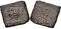 Progressively, after 185 BCE and the Greek invasion, coins were cast on both sides.[2] These coins are generally anonymous, and can carry Brahmi or Kharoshthi legends. These coins have quite specific types, depending mainly on the region where they were struck. Coins with a lion device are mainly known from Taxila, while coins with other symbols such as the Swastika or the Bodhi tree are attributed to the region of Gandhara.[2] These coins were cast during the rule of Indo-Greek kings Pantaleon and Agathocles in the area of Gandhara, and they are generally contemporary with those of Indo-Greek rulers.[9][7]