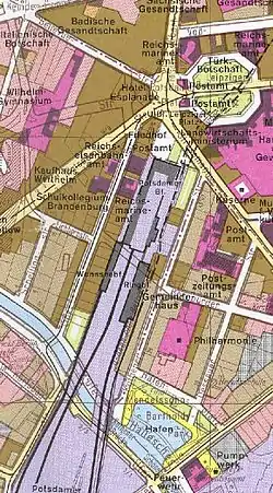Potsdamer Bahnhof had a unique location in post-war Berlin. Located in the so-called lower Friedrichsvorstadt the Potsdamer Bahnhof became part of the new Kreuzberg borough in 1920. Since a change of borough boundaries in 1938, the boroughs of Tiergarten and Kreuzberg lay on either side of Potsdamer Bahnhof, but the boundary of the borough of Mitte skirted around the site of Potsdamer Bahnhof,[1] so it formed a long thin rectangle within Mitte extending as a salient south from the rest of Mitte towards, and just over, the Landwehr Canal.[2] The result was that Potsdamer Bahnhof was in the Soviet Sector of Berlin, which became the de facto capital of East Germany, while the approach track and neighbourhood to the East were in the American Sector of Berlin, and the neighbourhood to the West in the British Sector.