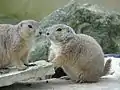 For black-tailed prairie dogs, the resident male of the family group fathers all the offspring.[21] Multiple paternity in litters seems to be more common in Utah and Gunnison's prairie dogs.[19] Mother prairie dogs do most of the care for the young. In addition to nursing the young, the mother also defends the nursery chamber and collects grass for the nest. Males play their part by defending the territories and maintaining the burrows.[18] The young spend their first six weeks below the ground being nursed.[17] They are then weaned and begin to surface from the burrow. By five months, they are fully grown.[17] The subject of cooperative breeding in prairie dogs has been debated among biologists. Some argue prairie dogs will defend and feed young that are not theirs,[22] and young seemingly sleep in a nursery chamber with other mothers; since most nursing occurs at night, this may be a case of communal nursing.[18] In the case of the latter, others suggest communal nursing occurs only when mothers mistake another female's young for their own. Infanticide is known to occur in prairie dogs. Males that take over a family group will kill the offspring of the previous male.[18] This causes the mother to go into estrus sooner.[18] However, most infanticide is done by close relatives.[18] Lactating females will kill the offspring of a related female both to decrease competition for the female's offspring and for increased foraging area due to a decrease in territorial defense by the victimized mother. Supporters of the theory that prairie dogs are communal breeders state that another reason for this type of infanticide is so that the female can get a possible helper. With their own offspring gone, the victimized mother may help raise the young of other females.