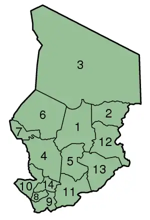 Batha · Biltine · Borkou-Ennedi-Tibesti · Chari-Baguirmi · Guéra · Kanem · Lac · Logone Occidental · Logone Oriental · Mayo-Kébbi · Moyen-Chari · Ouaddaï · Salamat · Tandjilé · | |||