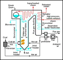 There are two types of air preheaters for use in steam generators in thermal power stations: One is a tubular type built into the boiler flue gas ducting, and the other is a regenerative air preheater.[1][2][7] These may be arranged so the gas flows horizontally or vertically across the axis of rotation.