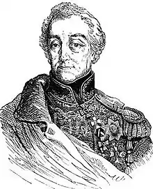 During the War of the Second Coalition, Hohenzollern again served in Italy. He commanded a brigade under Pál Kray in a battle at Legnago on 26 March 1799.[6] He fought at the Battle of Magnano where he temporarily commanded a division.[7] He besieged the Milan citadel starting on 30 April and received its surrender on 24 May.[8] On 12 June, with 4,300 soldiers, he attempted to block Jacques MacDonald's much larger French force at the Battle of Modena but was defeated with heavy losses.[9] He also fought at the battles of Trebbia and Novi. He won promotion to Feldmarschal-Leutnant in October 1799.