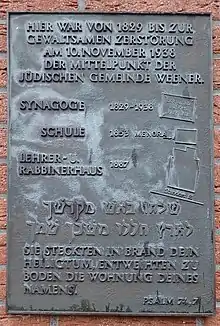 ![]() Psalm 74:7 ("They have set Thy sanctuary on fire") on a memorial plaque at the Weener Synagogue | |