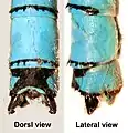 Eyes and thorax of the female is bluish green, marked as in the male. Color of the abdomen is similar to the male; but paler. Segments 8 and 9 are also black with fine apical blue rings. Segment 10 is pale blue.[5]