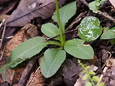 This greenhood is pollinated by a particular species of fungus gnat, attracted by a kairomone produced by the flower's labellum. The labellum tips the insect into the flower, and in attempting to escape, it comes into contact with the sexual organs of the flower and pollination occurs.[11]