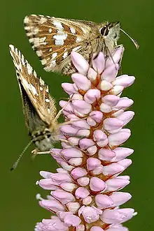 Pyrgus malvae, the grizzled skipper, is a butterfly species from the family Hesperiidae. It is a small skipper (butterfly) with a chequered pattern on its wings that appears to be black and white. This butterfly can be found throughout Europe and is common in central and southern regions of England. The butterfly prefers three major types of habitat: woodland, grassland, and industrial.[1] Referenced as a superspecies, Pyrgus malvae includes three semispecies: malvae, malvoides, and melotis.[2] Eggs are laid on plants that will provide warmth and proper nutrition for development. As larvae, their movement is usually restricted to a single plant, on which they will build tents, unless they move onto a second host plant. Larvae then spin cocoons, usually on the last host plant they have occupied, where they remain until spring. Upon emerging as adult butterflies, grizzled skippers are quite active during the day and tend to favour blue or violet-coloured plants for food.[1][3][4] They also possess multiple methods of communication; for example, vibrations are used to communicate with ants, and chemical secretions play a role in mating.[5][6] Exhibiting territorial behaviour, males apply perching and patrolling strategies to mate with a desired female.[1]