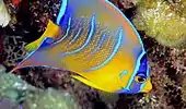 The queen angelfish (Holacanthus ciliaris), also known as the blue angelfish, golden angelfish, or yellow angelfish, is a species of marine angelfish found in the western Atlantic Ocean. It is a benthic (ocean floor) warm-water species that lives in coral reefs. It is recognized by its blue and yellow coloration and a distinctive spot or "crown" on its forehead. This crown distinguishes it from the closely related and similar-looking Bermuda blue angelfish (Holacanthus bermudensis), with which it overlaps in range and can interbreed.