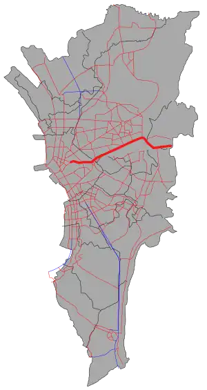 ![]() The route of Radial Road 6 in Metro Manila. Radial Road 6 is highlighted in red. | |