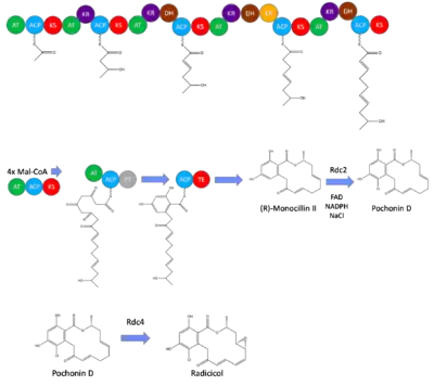 Biosynthesis of radicicol has been best studied in Pochonia chlamydosporia, in which the majority of the core structure is produced in vivo through iterative type I polyketide synthases.[1] This structure produced is the earliest intermediate in the radicicol biosynthesis, monocillin II. This intermediate is transformed to radicicol through halogenation and epoxide formation performed by RadH and RadP respectively.[2] These enzymes are coded by the genes Rdc2 and Rdc4 in the pathway, and removing either of these results in a product that has the monocillin II core, but does not have either the epoxide or halogen added.[2]
