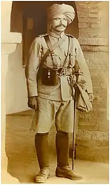 He enlisted into military service at 2nd Jammu and Kashmir Rifles which consisted of Muslims and Gurkhas.[3][4] He would attend the 1903 Delhi Durbar as a Major of the staff of the 5th Infantry Brigade of the 2nd Infantry Division.[5] During his military career, he earned the title of Sardar Bahadur, being promoted to Commander-in-chief as well as earning the Order of British India.[6] Along with the command of Lieutenant Colonel Durga Singh, Singh Pathania's leadership was seen as competent and reliable by the commander of Indian Expeditionary Force B, General Arthur Aitken.[7] Upon the outbreak of World War I, the then Lieutenant Colonel Pathania was in charge of mobilizing the 2nd Kashmir Rifles from 12 to 15 September with the regiment leaving Jammu at the end of the month to meet up with the rest of the Imperial Service Infantry Brigade which was to be concentrated at Deolali by 1 October.[8]