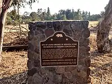 The registration for the site of Juana Briones de Miranda home as a historic resource dates back to November 1, 1954.[13] A commemorative plaque that designates this site as California Historical Landmark 524 plaque commemorating the site of Juana Briones de Miranda home on Rancho La Purísima Concepción at 4157 Old Adobe Road, Palo Alto, California. The plaque was placed by the California State Parks in cooperation with the Juana Briones Heritage Foundation and the city of Palo Alto, on March 12, 2007.[13]