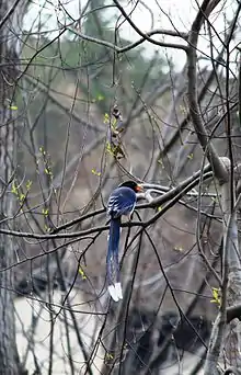 The red-billed blue magpie (Urocissa erythroryncha) is a species of bird in the crow family, Corvidae. It is about the same size as the Eurasian magpie, but has a much longer tail, one of the longest of any corvid. It is 65–68 cm (25.5–27 in) long and weighs 196–232 g (6.9–8.2 oz).[2]