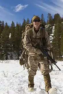 A religious program specialist during the Iraq War. When serving in the Fleet Marine Force (FMF), religious program specialists wear the U.S. Marine Corps Combat Utility Uniform (MCCUU) identical to the uniforms worn by their Marine Corps counterparts with the exception of "U.S. Navy" tape and US Navy rank insignias.
