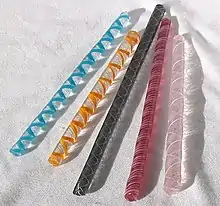 A simple single-thread cane can then be used to make more complex canes. A small bundle of single-thread canes can be heated until they fuse, or heated canes, laid parallel, can be picked up on the circumference of a hot cylinder of clear or colored glass. This bundle, treated just as the chunk of color in the description above, is cased in clear glass and pulled out, forming a vetro a fili cane with multiple threads and perhaps a clear or solid color core. If the cane is twisted as it is pulled, the threads take a spiral shape called vetro a retorti (twisted glass) or zanfirico. [3] [5]