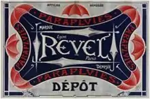 In 1922, Revel engaged the famous Italian poster art designer Leonetto Cappiello to create the famous ad representing three people with umbrellas, it was published by the fine parisian printer's firm, Devambez, in the name of "Les Nouvelles Affiches Leonetto Cappiello".[2]