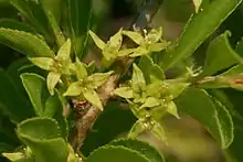 The family contains about 55 genera and 950 species.[5] The Rhamnaceae have a worldwide distribution, but are more common in the subtropical and tropical regions. The earliest fossil evidence of Rhamnaceae is from the Late Cretaceous. Fossil flowers have been collected from the Upper Cretaceous of Mexico and the Paleocene of Argentina.[6]