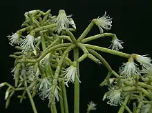 The Rhipsalideae are a small tribe of cacti, comprising four or five genera (and around 60 species). They grow on trees (epiphytes) or on rocks (lithophytes), where they either hang down or form creeping or upright shrubs. Their flowers open in the day and remain open at night; they may be either radially symmetrical (regular) or bilaterally symmetrical (zygomorphic). The fruits are berry-like, fleshy with smallish seeds.[2]