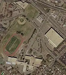 The building was completed in 1942 at 49,167 sq ft (4,567.8 m2), after a fire destroyed the old high school in 1940. Additions to the school were made in 1952 at 39,895 sq ft (3,706.4 m2), 1959 at 37,425 sq ft (3,476.9 m2), in 1964 at 56,703 sq ft (5,267.9 m2), 1969 at 4,000 sq ft (370 m2), 1975 at 35,890 sq ft (3,334 m2), 1976 at 8,300 sq ft (770 m2), and 1988 at 1,938 sq ft (180.0 m2). The current campus is 26.2 acres (106,000 m²) in size.[3][13]