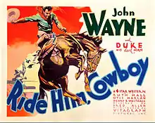 Ride Him, Cowboy is a 1932 pre-Code Western film directed by Fred Allen for Warner Brothers, starring a 25-year-old John Wayne. Based on the 1923 novel of the same name by Kenneth Perkins, the film is a remake of The Unknown Cavalier, a 1926 silent Western starring Ken Maynard, with much stock footage from the original. The film was released as The Hawk in the U.K.[2]