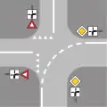 • A yellow flashing traffic light warns of special caution, and the general road rules, priority signs, and road markings have to be applied and followed (in particular stop signs (see 3.01) or give way signs (see 3.02) and all other priority signs, or direction indications (e.g. see 2.32–2.43, 2.46, 6.06, 6.10, 6.13), and others)!
