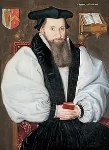 In 1594, Abbot appeared as a writer with A Mirror of Popish Subtilties (1594) which was designed as a refutation of the arguments advanced by Nicholas Sander and Robert Bellarmine against the Protestant theory of the sacraments.[2] The occasion for this work was a disputation in which Abbot had been involved, with a Marian Father Paul Spence who was being held prisoner in Worcester Castle.[6] Antichristi Demonstratio [A Demonstration of Antichrist] (1603), was against Bellarmine once more. It was admired by the new king James I, who ordered material from his own Paraphrase on the Apocalypse to be printed with it in a second edition of 1608. Abbot was concerned to refute Bellarmine's reading of the Book of Revelation as literal and innovative (by comparison with the tradition of Nicholas of Lyra on Revelation 13), and to attack what would be identified later as the futurist approach in the tradition of Francisco Ribera. Abbot's own reading was typically historicist and concerned to argue for the Pope as Antichrist.[7]